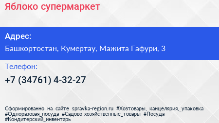 Яблоко, супермаркет по адресу Башкортостан, Кумертау, Мажита Гафури, 3 в дальнейшем Организация, размещена в следующих категориях: