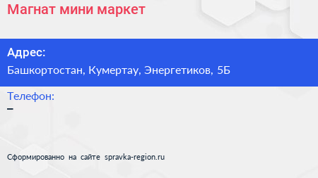 Магнат, мини-маркет по адресу Башкортостан, Кумертау, Энергетиков, 5Б в дальнейшем Организация, размещена в следующих категориях: