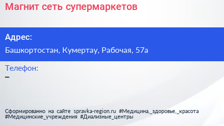 Магнит, сеть супермаркетов по адресу Башкортостан, Кумертау, Рабочая, 57а в дальнейшем Организация, размещена в следующих категориях: