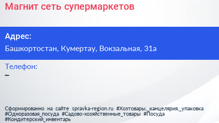 Магнит, сеть супермаркетов по адресу Башкортостан, Кумертау, Вокзальная, 31а в дальнейшем Организация, размещена в следующих категориях: