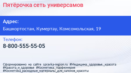 Пятёрочка, сеть универсамов по адресу Башкортостан, Кумертау, Комсомольская, 19 в дальнейшем Организация, размещена в следующих категориях: