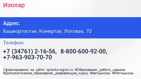 Изолар по адресу Башкортостан, Кумертау, Логовая, 72 в дальнейшем Организация, размещена в следующих категориях: