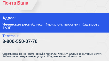 Почта Банк по адресу Чеченская республика, Курчалой, проспект Кадырова, 163Б в дальнейшем Организация, размещена в следующих категориях: