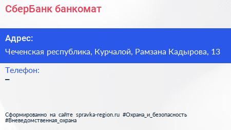СберБанк, банкомат по адресу Чеченская республика, Курчалой, Рамзана Кадырова, 13 в дальнейшем Организация, размещена в следующих категориях:
