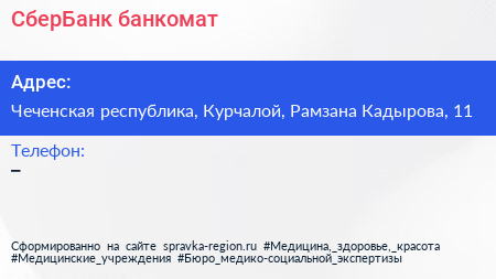 СберБанк, банкомат по адресу Чеченская республика, Курчалой, Рамзана Кадырова, 11 в дальнейшем Организация, размещена в следующих категориях: