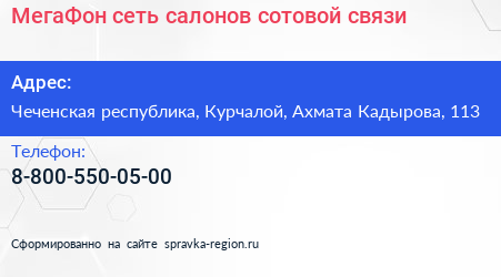 МегаФон, сеть салонов сотовой связи по адресу Чеченская республика, Курчалой, Ахмата Кадырова, 113 в дальнейшем Организация, размещена в следующих категориях: