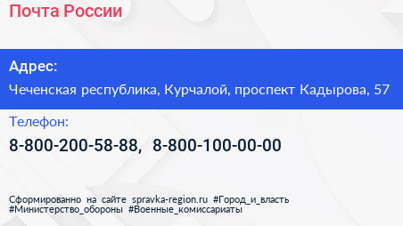 Почта России по адресу Чеченская республика, Курчалой, проспект Кадырова, 57 в дальнейшем Организация, размещена в следующих категориях: