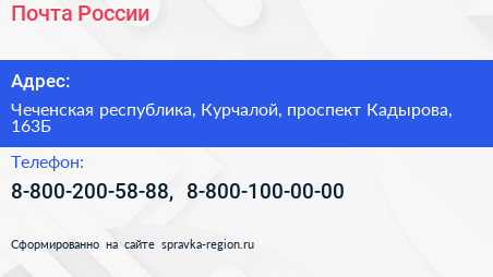 Почта России по адресу Чеченская республика, Курчалой, проспект Кадырова, 163Б в дальнейшем Организация, размещена в следующих категориях: