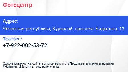 Фотоцентр по адресу Чеченская республика, Курчалой, проспект Кадырова, 13 в дальнейшем Организация, размещена в следующих категориях: