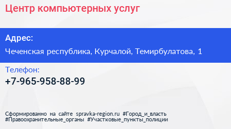 Центр компьютерных услуг по адресу Чеченская республика, Курчалой, Темирбулатова, 1 в дальнейшем Организация, размещена в следующих категориях: