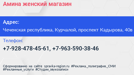 Амина, женский магазин по адресу Чеченская республика, Курчалой, проспект Кадырова, 40в в дальнейшем Организация, размещена в следующих категориях: