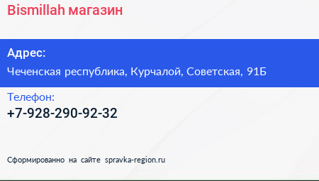 Bismillah, магазин по адресу Чеченская республика, Курчалой, Советская, 91Б в дальнейшем Организация, размещена в следующих категориях:
