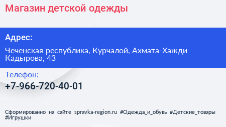 Магазин детской одежды по адресу Чеченская республика, Курчалой, Ахмата-Хажди Кадырова, 43 в дальнейшем Организация, размещена в следующих категориях: