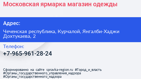 Московская ярмарка, магазин одежды по адресу Чеченская республика, Курчалой, Янгалби-Хаджи Дохтукаева, 2 в дальнейшем Организация, размещена в следующих категориях: