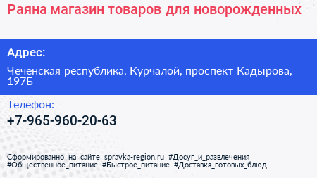 Раяна, магазин товаров для новорожденных по адресу Чеченская республика, Курчалой, проспект Кадырова, 197Б в дальнейшем Организация, размещена в следующих категориях: