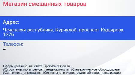 Магазин смешанных товаров по адресу Чеченская республика, Курчалой, проспект Кадырова, 197Б в дальнейшем Организация, размещена в следующих категориях: