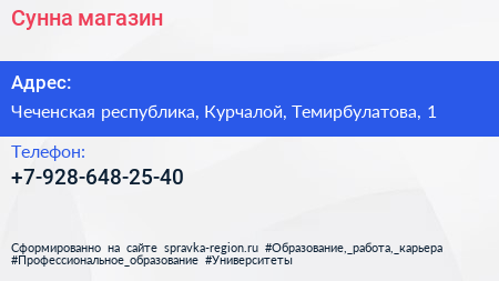 Сунна, магазин по адресу Чеченская республика, Курчалой, Темирбулатова, 1 в дальнейшем Организация, размещена в следующих категориях: