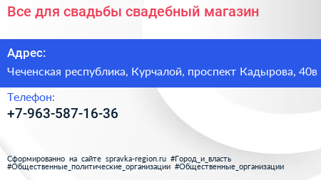 Все для свадьбы, свадебный магазин по адресу Чеченская республика, Курчалой, проспект Кадырова, 40в в дальнейшем Организация, размещена в следующих категориях: