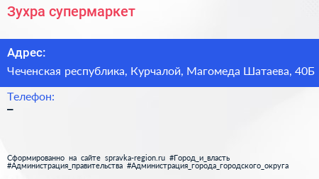 Зухра, супермаркет по адресу Чеченская республика, Курчалой, Магомеда Шатаева, 40Б в дальнейшем Организация, размещена в следующих категориях: