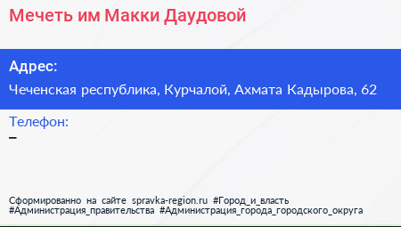 Мечеть им. Макки Даудовой по адресу Чеченская республика, Курчалой, Ахмата Кадырова, 62 в дальнейшем Организация, размещена в следующих категориях: