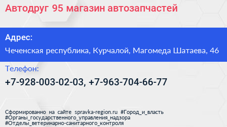 Автодруг 95, магазин автозапчастей по адресу Чеченская республика, Курчалой, Магомеда Шатаева, 46 в дальнейшем Организация, размещена в следующих категориях: