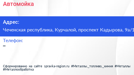 Автомойка по адресу Чеченская республика, Курчалой, проспект Кадырова, 9а/1 в дальнейшем Организация, размещена в следующих категориях: