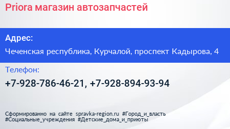 Priora, магазин автозапчастей по адресу Чеченская республика, Курчалой, проспект Кадырова, 4 в дальнейшем Организация, размещена в следующих категориях: