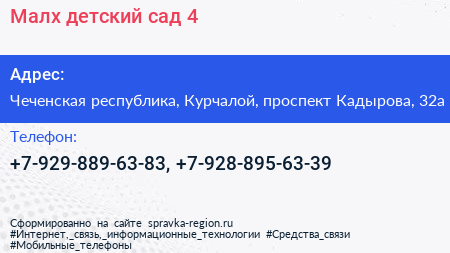Малх, детский сад №4 по адресу Чеченская республика, Курчалой, проспект Кадырова, 32а в дальнейшем Организация, размещена в следующих категориях: