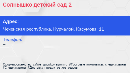 Солнышко, детский сад №2 по адресу Чеченская республика, Курчалой, Касумова, 11 в дальнейшем Организация, размещена в следующих категориях: