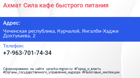 Ахмат Сила, кафе быстрого питания по адресу Чеченская республика, Курчалой, Янгалби-Хаджи Дохтукаева, 2 в дальнейшем Организация, размещена в следующих категориях: