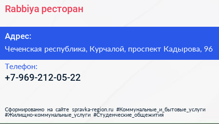 Rabbiya, ресторан по адресу Чеченская республика, Курчалой, проспект Кадырова, 96 в дальнейшем Организация, размещена в следующих категориях: