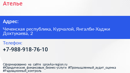 Ателье по адресу Чеченская республика, Курчалой, Янгалби-Хаджи Дохтукаева, 2 в дальнейшем Организация, размещена в следующих категориях: