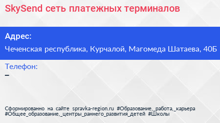 SkySend, сеть платежных терминалов по адресу Чеченская республика, Курчалой, Магомеда Шатаева, 40Б в дальнейшем Организация, размещена в следующих категориях: