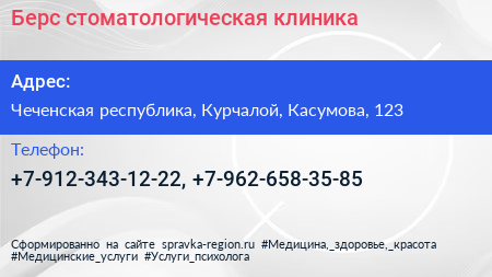 Берс, стоматологическая клиника по адресу Чеченская республика, Курчалой, Касумова, 123 в дальнейшем Организация, размещена в следующих категориях: