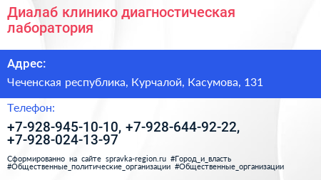 Диалаб, клинико-диагностическая лаборатория по адресу Чеченская республика, Курчалой, Касумова, 131 в дальнейшем Организация, размещена в следующих категориях:
