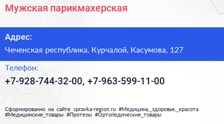 Мужская парикмахерская по адресу Чеченская республика, Курчалой, Касумова, 127 в дальнейшем Организация, размещена в следующих категориях: