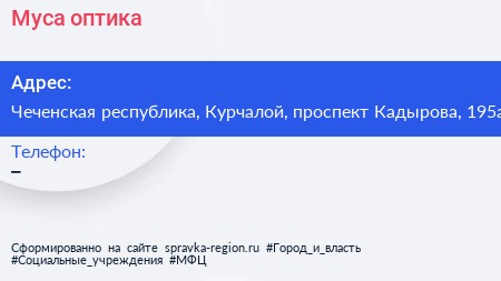 Муса, оптика по адресу Чеченская республика, Курчалой, проспект Кадырова, 195а в дальнейшем Организация, размещена в следующих категориях: