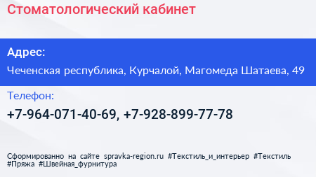 Стоматологический кабинет по адресу Чеченская республика, Курчалой, Магомеда Шатаева, 49 в дальнейшем Организация, размещена в следующих категориях: