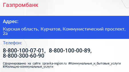 Газпромбанк по адресу Курская область, Курчатов, Коммунистический проспект, 2а в дальнейшем Организация, размещена в следующих категориях: