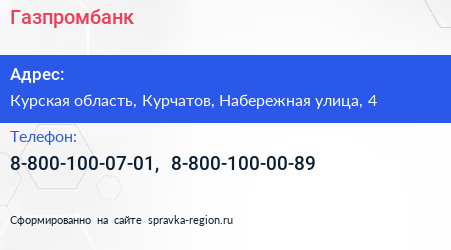 Газпромбанк по адресу Курская область, Курчатов, Набережная улица, 4 в дальнейшем Организация, размещена в следующих категориях: