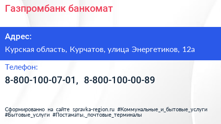 Газпромбанк, банкомат по адресу Курская область, Курчатов, улица Энергетиков, 12а в дальнейшем Организация, размещена в следующих категориях: