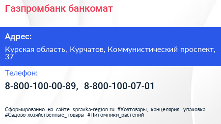 Газпромбанк, банкомат по адресу Курская область, Курчатов, Коммунистический проспект, 37 в дальнейшем Организация, размещена в следующих категориях: