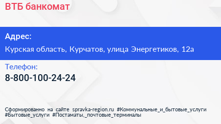 ВТБ, банкомат по адресу Курская область, Курчатов, улица Энергетиков, 12а в дальнейшем Организация, размещена в следующих категориях: