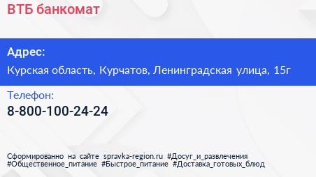 ВТБ, банкомат по адресу Курская область, Курчатов, Ленинградская улица, 15г в дальнейшем Организация, размещена в следующих категориях: