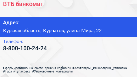 ВТБ, банкомат по адресу Курская область, Курчатов, улица Мира, 22 в дальнейшем Организация, размещена в следующих категориях: