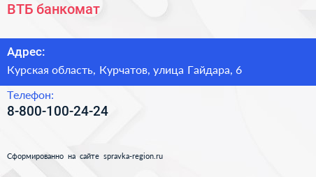 ВТБ, банкомат по адресу Курская область, Курчатов, улица Гайдара, 6 в дальнейшем Организация, размещена в следующих категориях:
