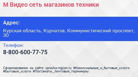 М.Видео, сеть магазинов техники по адресу Курская область, Курчатов, Коммунистический проспект, 30 в дальнейшем Организация, размещена в следующих категориях: