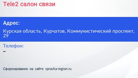 Tele2, салон связи по адресу Курская область, Курчатов, Коммунистический проспект, 29 в дальнейшем Организация, размещена в следующих категориях: