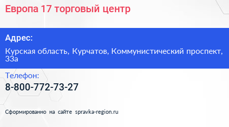 Европа-17, торговый центр по адресу Курская область, Курчатов, Коммунистический проспект, 33а в дальнейшем Организация, размещена в следующих категориях: