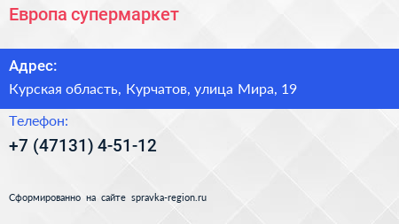 Европа, супермаркет по адресу Курская область, Курчатов, улица Мира, 19 в дальнейшем Организация, размещена в следующих категориях: